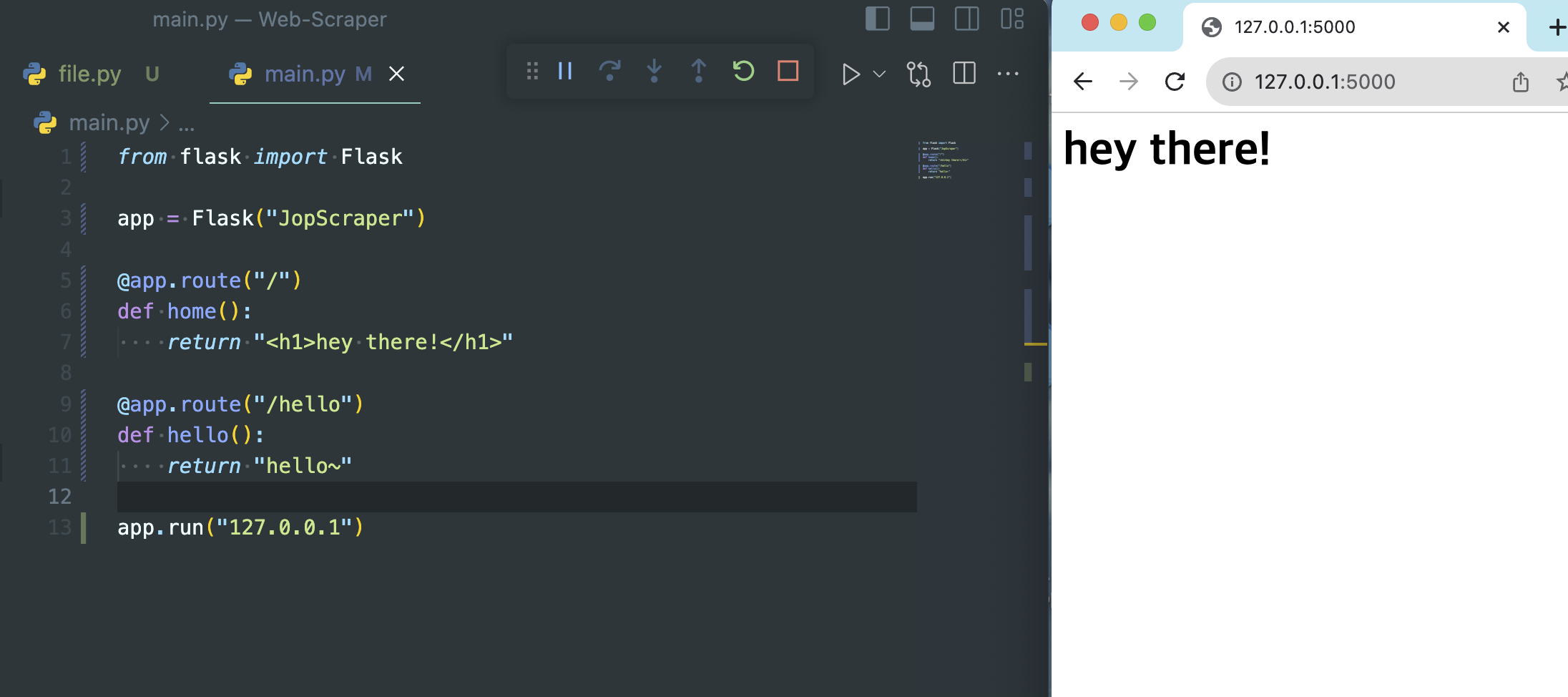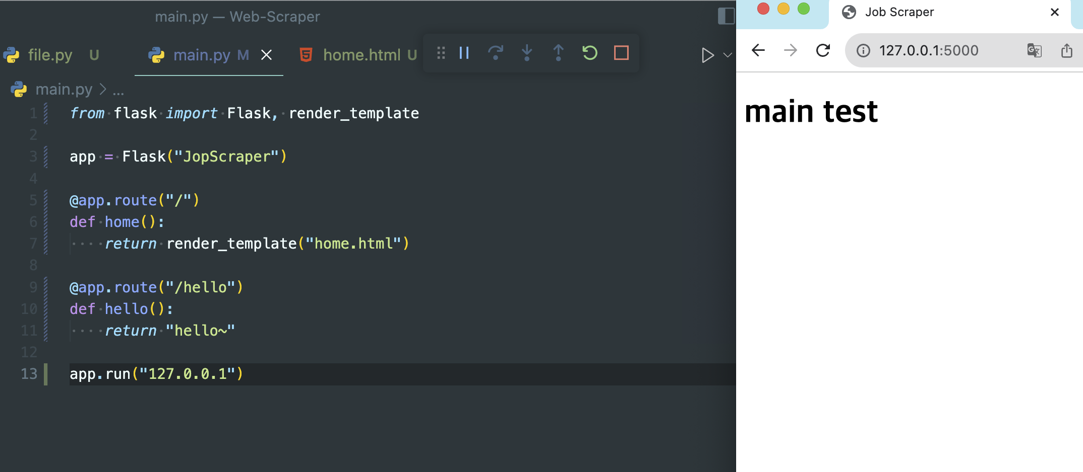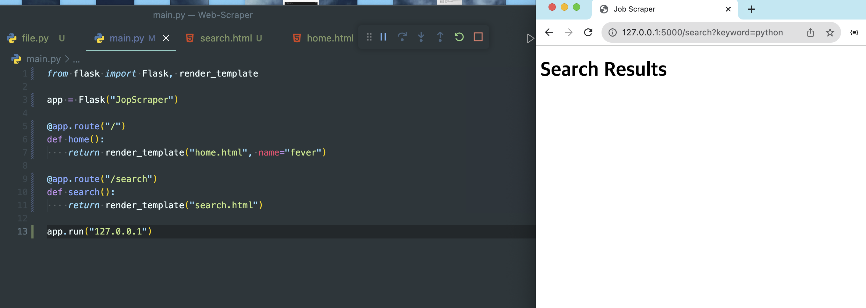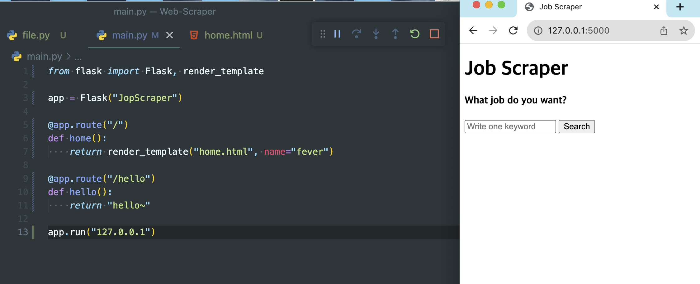 - app = Flask("JopScraper")로 app 이름을 정하고, app.run으로 로컬 서버에 실행하여 테스트 진행한다.