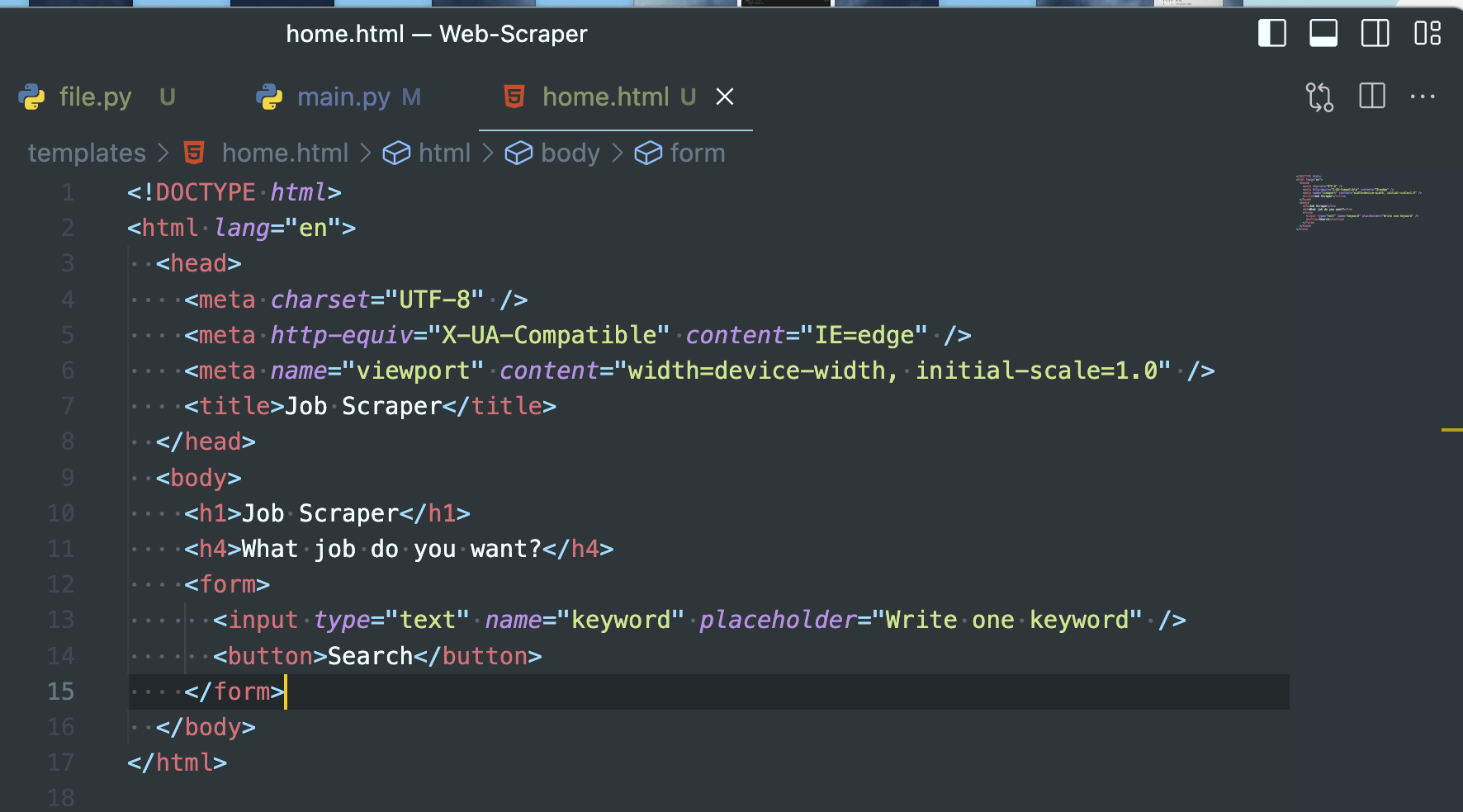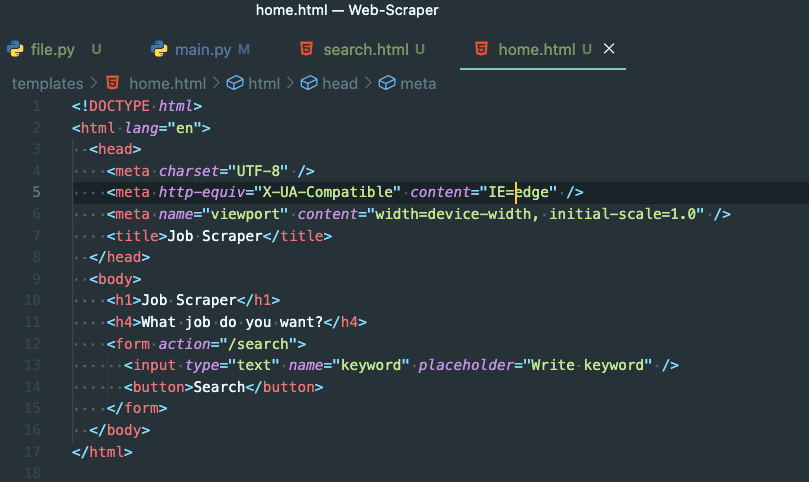- 이제 html을 이용해서 form을 만들어준다. name은 후에 키워드를 받아야 하기 때문에 keyword로 지정해주자.