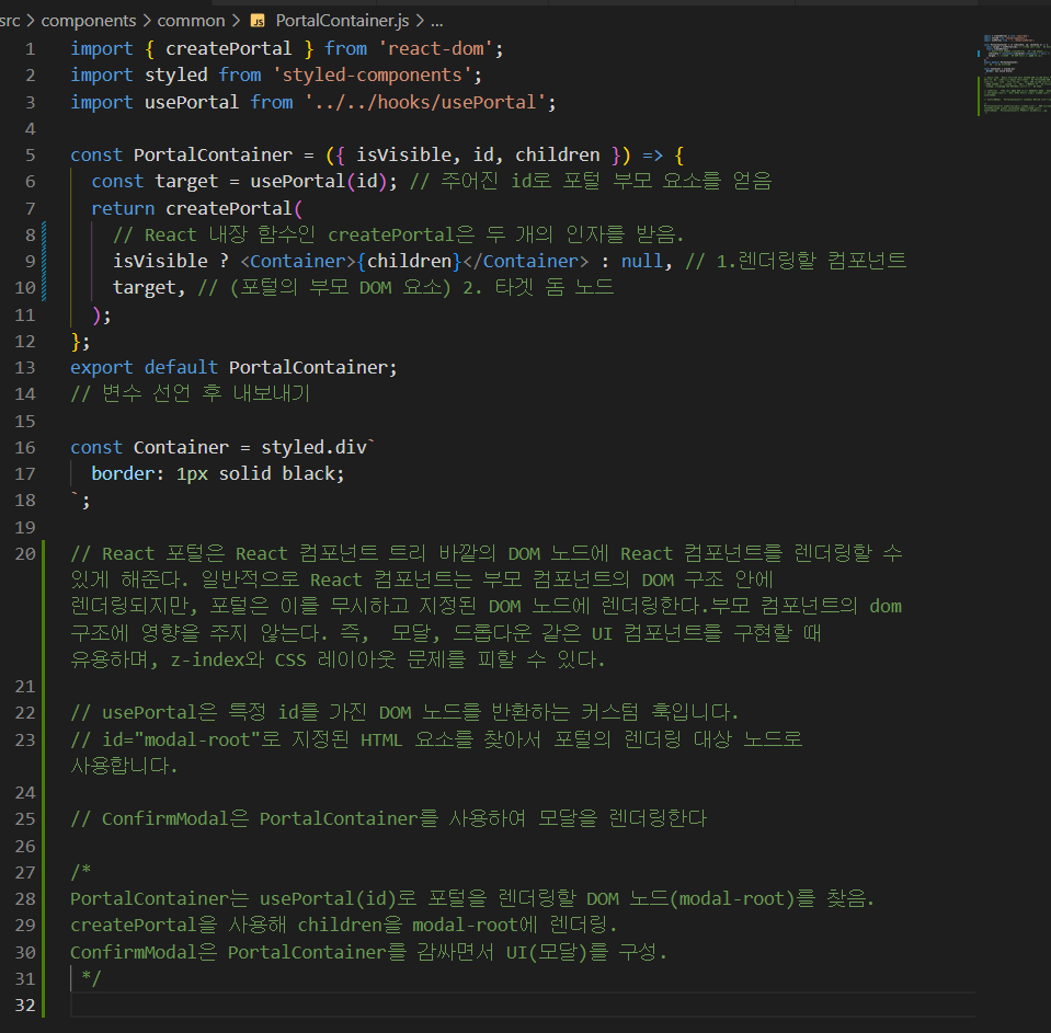 ConfirmModal은 PortalContainer를 사용하여 모달을 렌더링한다.