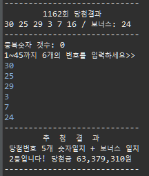 System.out.println(" 당첨번호 "+sameCnt+"개 숫자일치 + 보너스 일치 ");