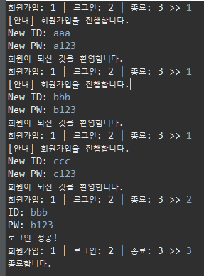 System.out.print("회원가입: 1 | 로그인: 2 | 종료: 3 >> ");