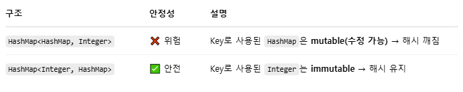 하지만 HashMap은 mutable이기 때문에 key로 쓰면 위험하다. 수정이 불가능한 객체를 Key로 사용하는 것이 좋다.