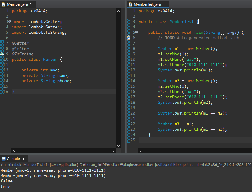 return mno == target.mno && name.equals(target.name) && phone.equals(target.phone);