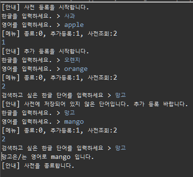 System.out.println("[안내] 사전을 종료합니다.");
