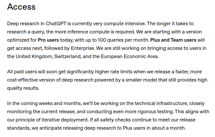 최근 opanAI 구독자에게 deepresearch가 공개되었다. plus 구독자는 한달에 10번, 그리고 pro 구독자는 100번 사용이 가능하다.