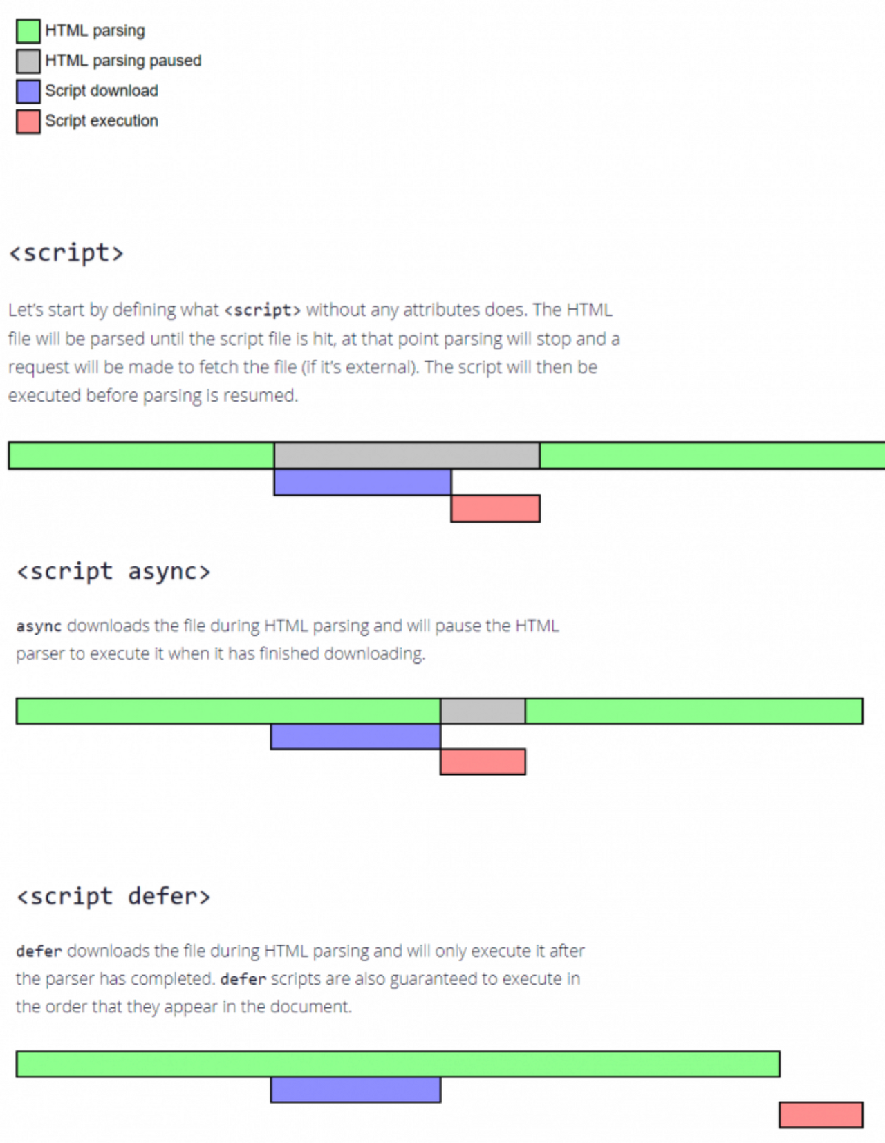 Html 파싱과 외부 js 파일의 로드가 비동기적으로(기다리지 않고) 동시에 진행 된다. 자바스크립트의 파일의 파싱과 실행은 자바스크립트 파일의 로드(다운로드)가 완료된 직후 진행되며, 이 때 HTML 파싱이 중단된다.