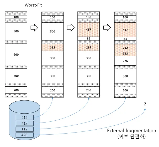 최적 적합의 반대 방식입니다. 가장 큰 빈 청크를 찾아 요청된 크기만큼만 반환하고 남는 부분은 빈 공간 리스트에 계속 유지됩니다. 최적 적합 방식에서 발생할 수 있는 수많은 작은 청크 대신에 커다란 빈 청크를 남기려고 시도합니다. 그러나 다시 한번 항상 빈 공간 전체를 탐색해야 하기 때문에 역시 높은 비용을 지불해야 합니다.
