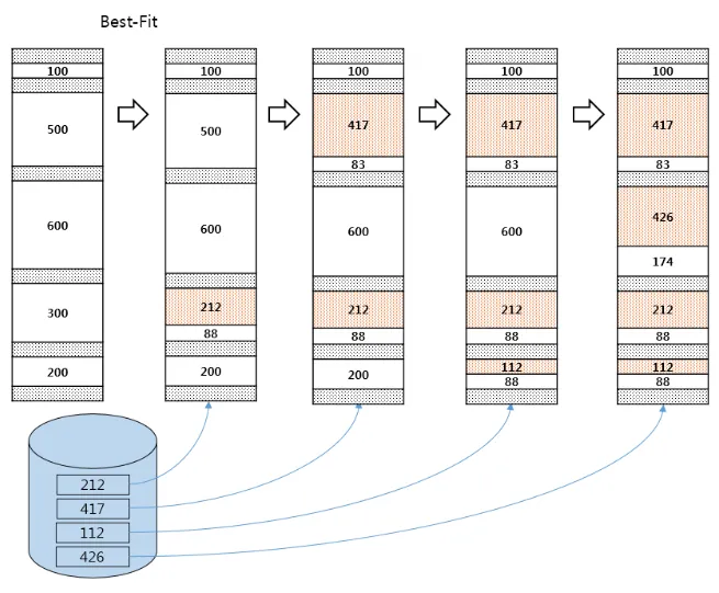 이거 빈 공간 리스트를 만들어야 한다. 그리고 리스트를 조회해서 요청한 크기와 같거나 더 큰 빈 메모리 청크를 찾는다. 그 후, 후보자 그룹 중에서 가장 작은 크기의 청크를 반환합니다. Best fit은 빈 공간 리스트를 한 번만 순회하면 반환할 블록을 찾을 수 있지만 요청이 들어올 때마다 리스트를 순회해야 되는 비용이 발생한다.