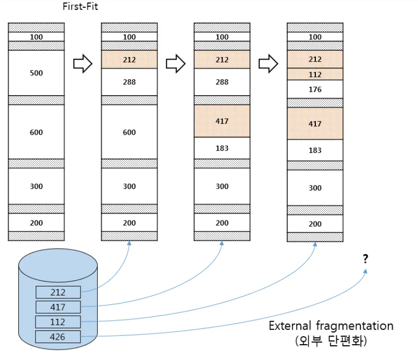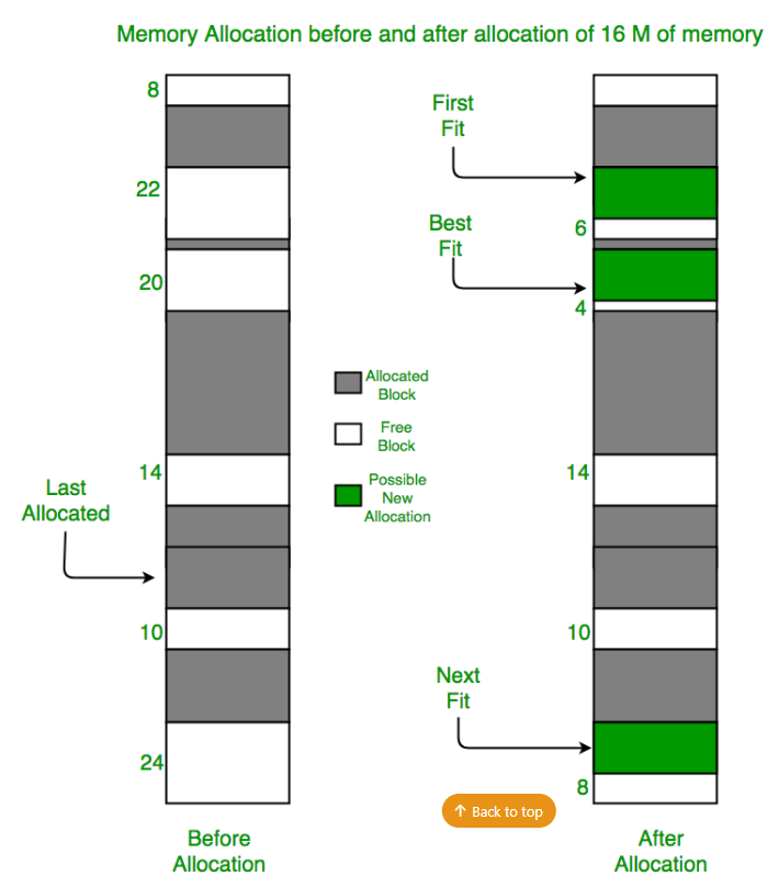 이거 구현해봤는데 현재 할당 할당된 공간을 가리키는 포인터를 두고, 다음 할당할 공간을 찾을 때는 현재 위치부터 탐색을 시작했던 것 같다. 만약 탐색이 되지 않는다면 first fit처럼 처음부터 탐색을 했던 것 같은데 내 정확하지는 않다.