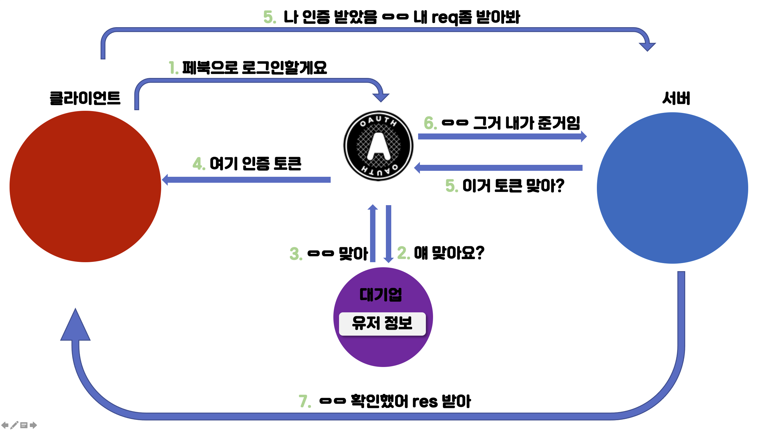 반면 OAuth는 인증 중개과정을 외주로 맡기는 메커니즘을 의미한다. 다시 말해, 이미 기존 사용자의 정보를 충분히 가지고 있는 웹 서비스의 힘을 빌려 OAuth가 대신 토큰을 발급한 후, 이를 사용해 인증한 해당 서비스를 통해서 사용자의 정보를 받아오거나, 세션을 부여해 로그인 상태를 유지실 수 있게된다.