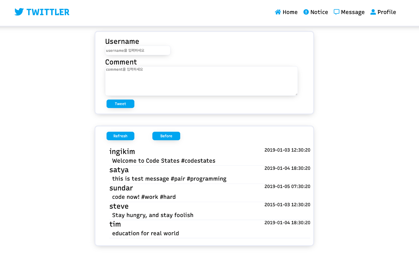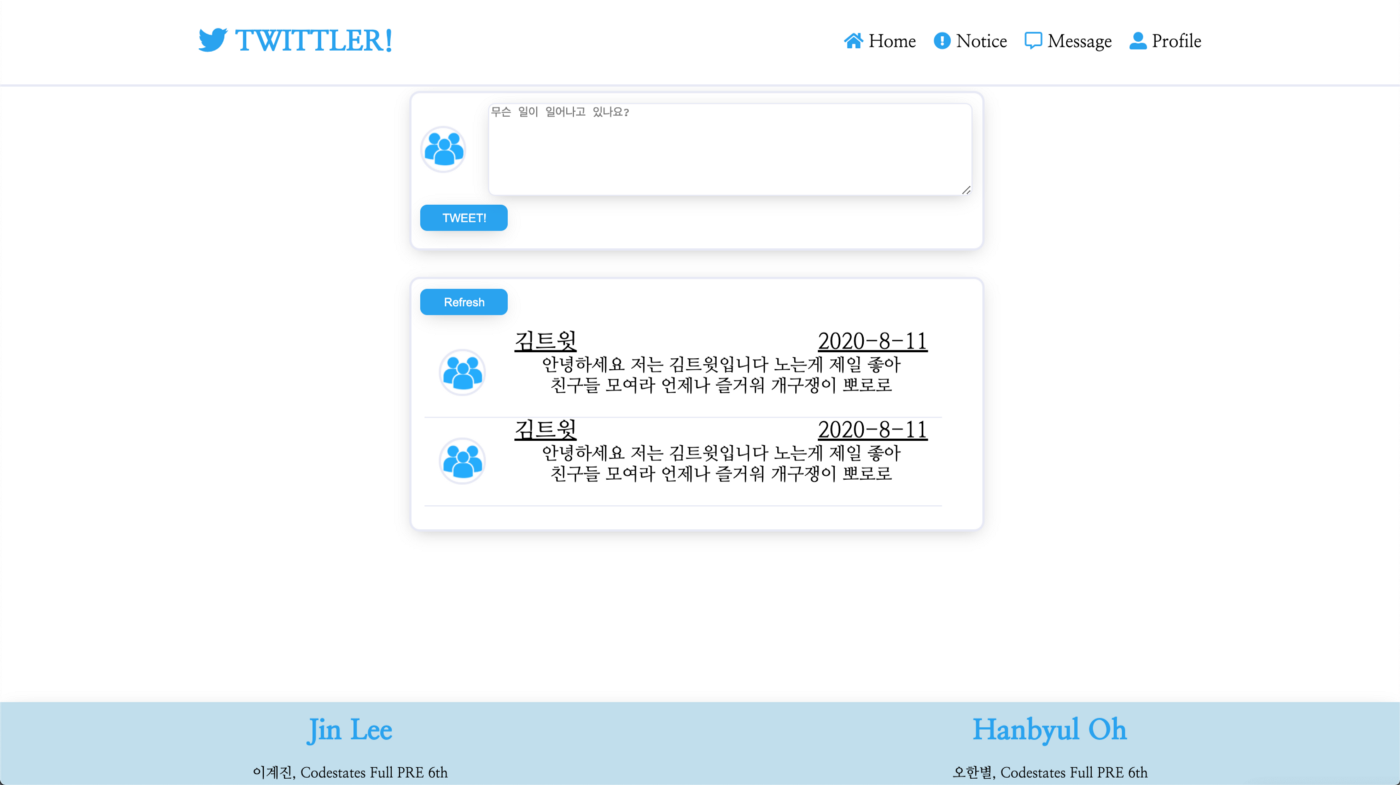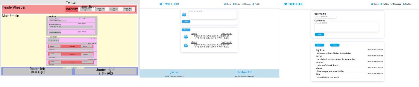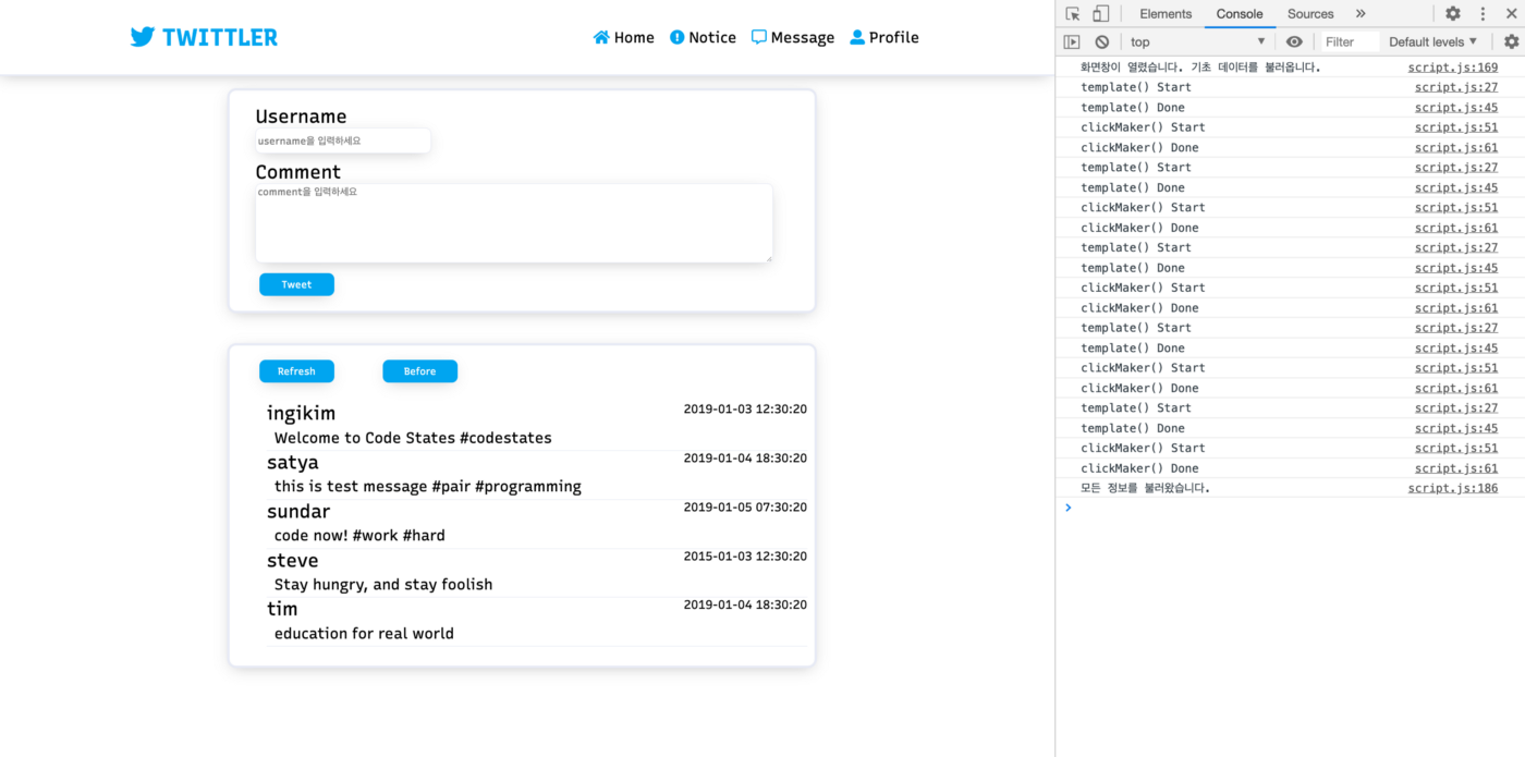 코드스테이츠 3주 차, 3번째 스프린트를 마쳤다. 스프린트명은 Twittler다. HTML, CSS, 그리고 JS를 활용한 DOM control로 기초적인 트위터 프론트엔드 화면을 구현하는 것에 목적이 있다. 페어와 함께 간단한 ui를 그리고, 실제로 구현하고, 그리고 작성한 정적 페이지에 동적인 컨트롤을 추가하는 과정이 꽤나 벅차지만 결과물이 눈에 보여서인지, 보람 있는 스프린트였다.