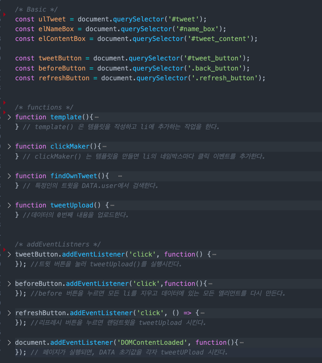 트윗을 작성하고 트윗 버튼을 누르면 내용이 바로 아래로 들어가는 것이 아니라, 작성한 트윗이 DATA obj에 저장이 되는 과정이 선행되어야 하고, 그 이후에 DATA obj에 있는 해당 트윗 element를 불러와 아래 트윗에 구현시켜야 한다.