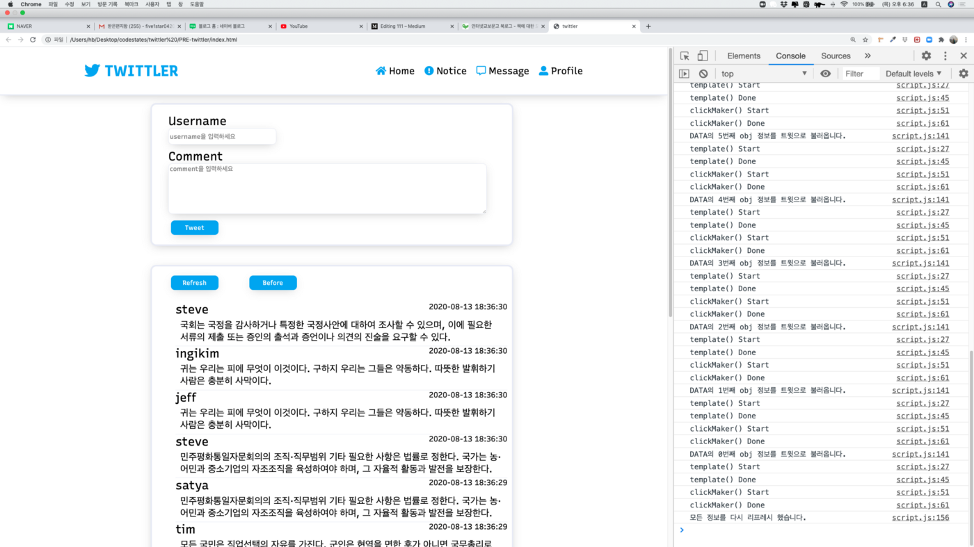 1.화면이 켜지면 DATA obj에 저장된 다섯 개의 트윗이 나열된다.