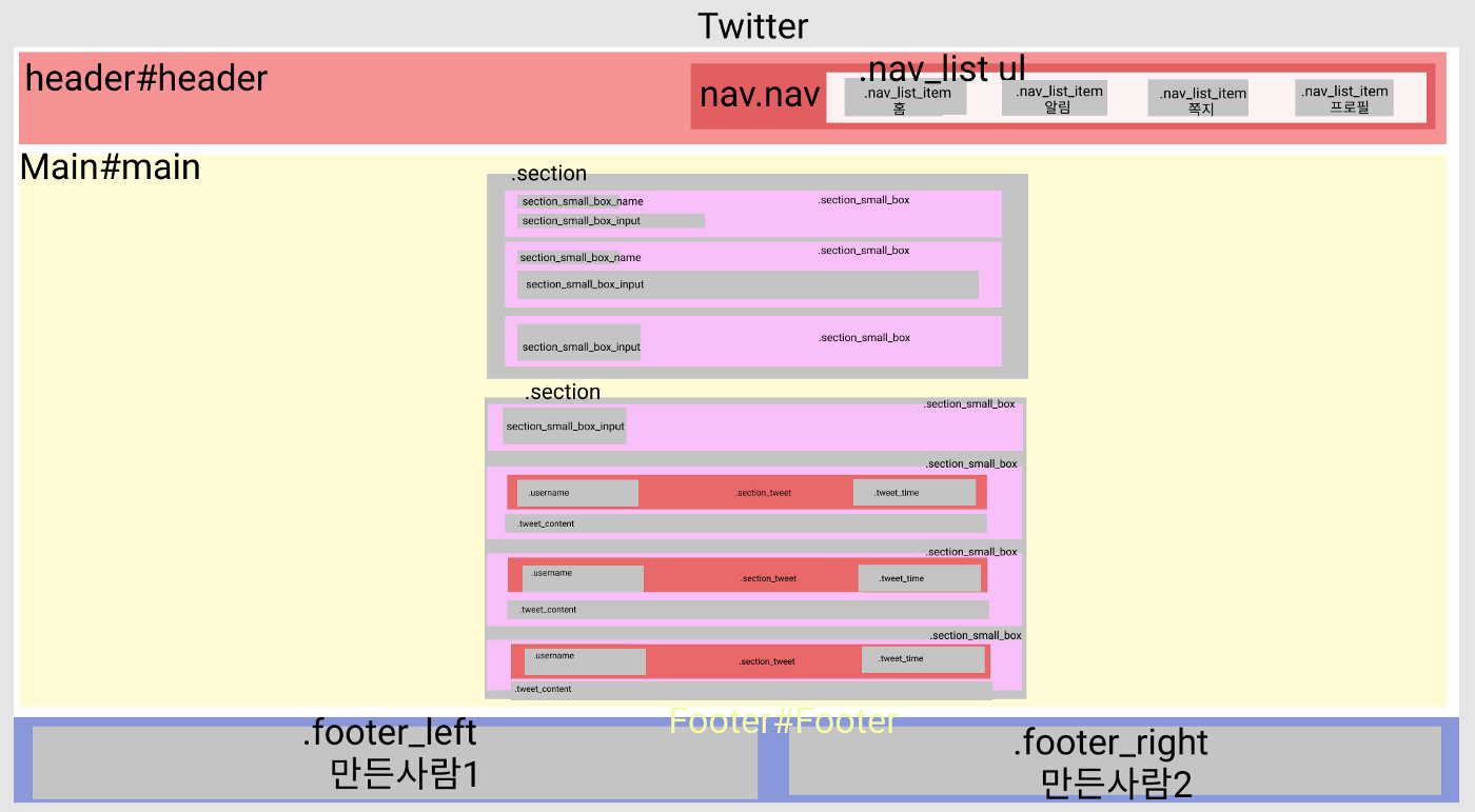 목업을 구현하던 중 와이어프레임과 변동사항이 있었다. 하나는 아이콘 이미지를 추가한 것이고(추후에 다시 지웠다..), 다른 하나는 트윗 출력 창을div에서 li로 변경했다. 동일한 형태를 반복해서 작성하는 데는 list 형태가 보다 적합하다는 것이 결론이었다.