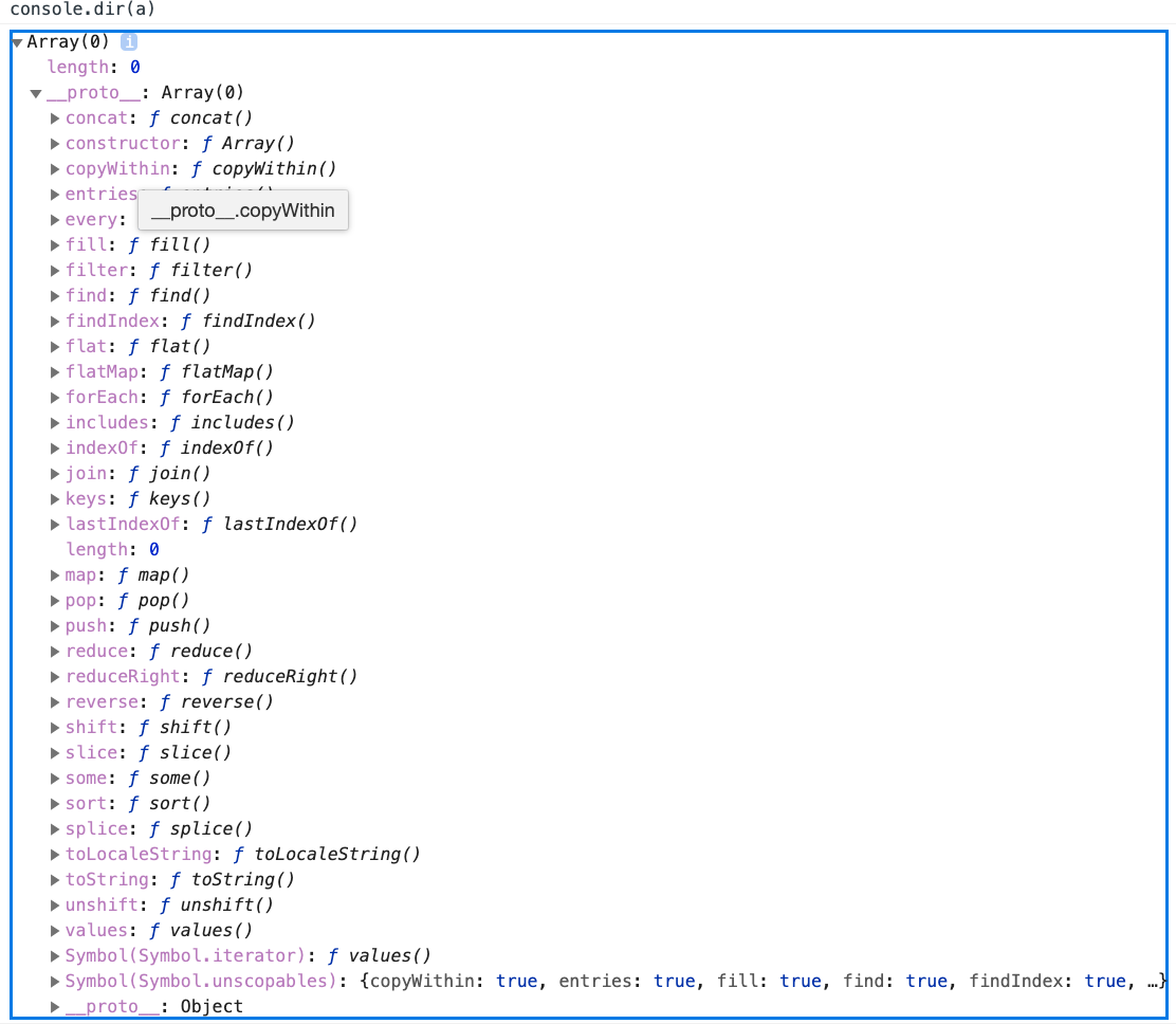 임의로 생성한 빈 어레이는 당연히 Array method를 사용할 수 있다. 이유는 임의의 어레이 a가 자바스크립트에 내장된 array 컨스트럭터를 기반으로 생성되었기 때문이다. 그리고 다시 Array는 프로토타입으로 자바스크립트의 Object로 가지고 있다.