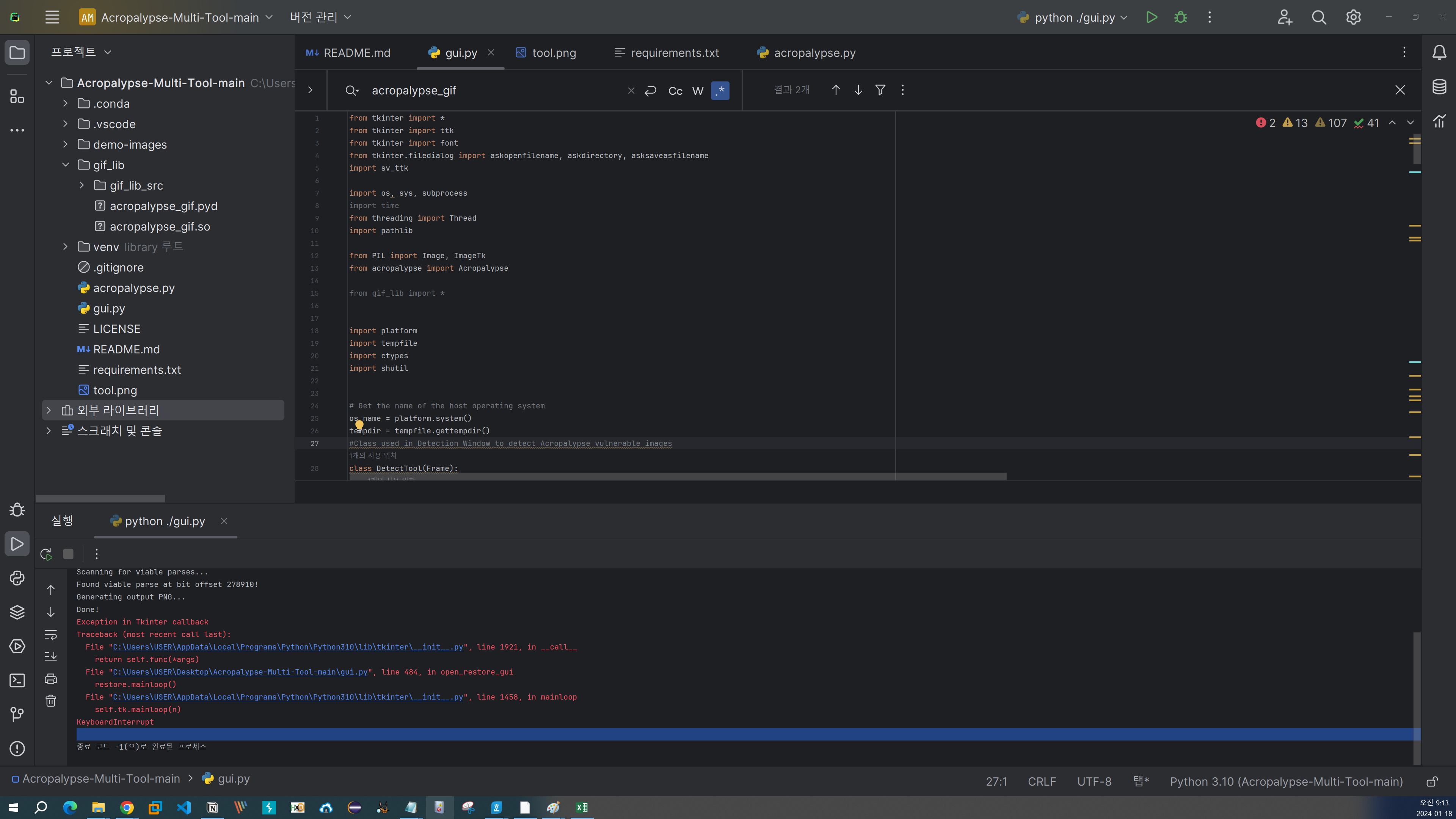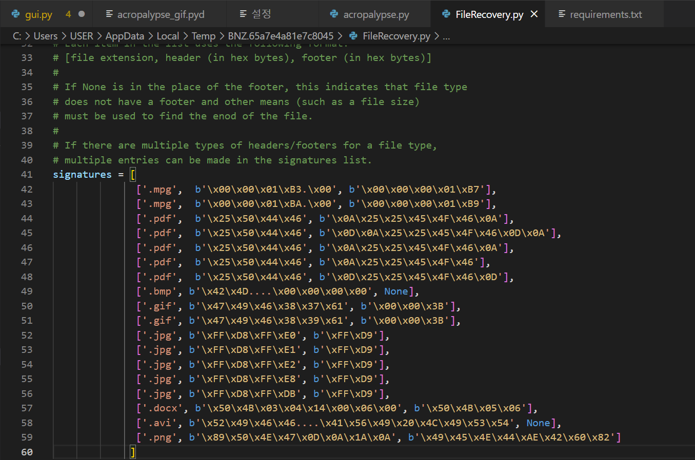 윈도우 OS에서 수정한 이미지에서 삭제되지 않은 파일의 일부를 가져와 PNG 파일을 생성하는 코드를 사용했다.