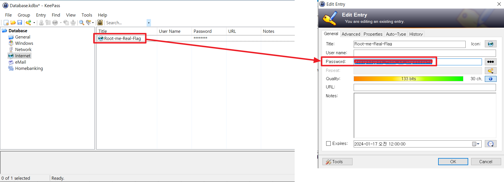 해당 패스워드로 CASE 제시에서 주어진 Keepass DB 파일을 열면 플래그가 나온다.