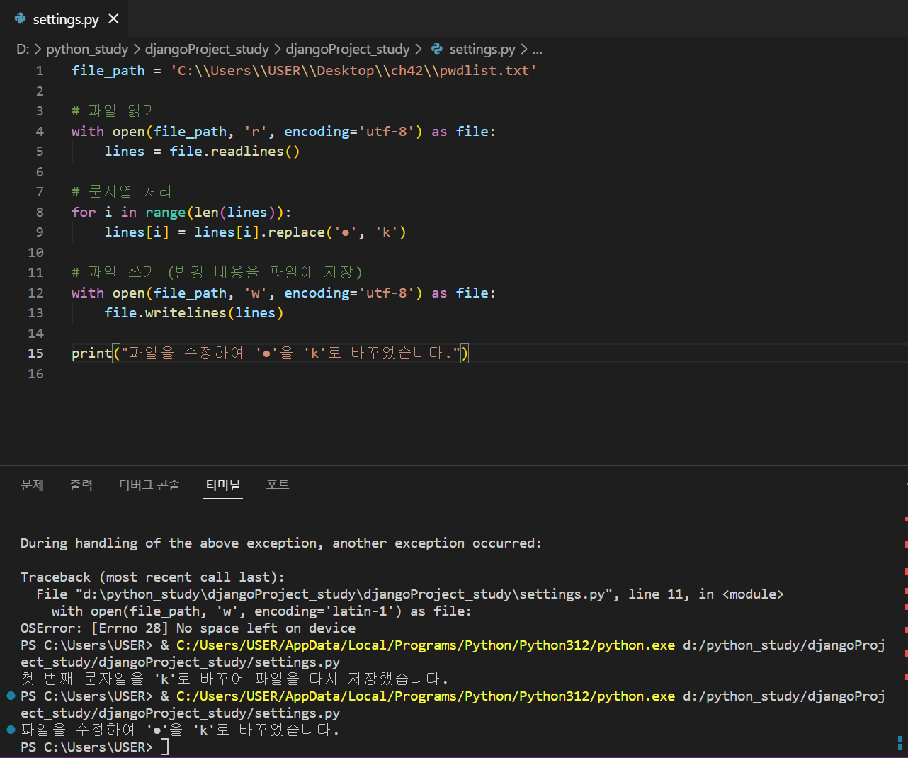 print("파일을 수정하여 '●'을 'k'로 바꾸었습니다.")