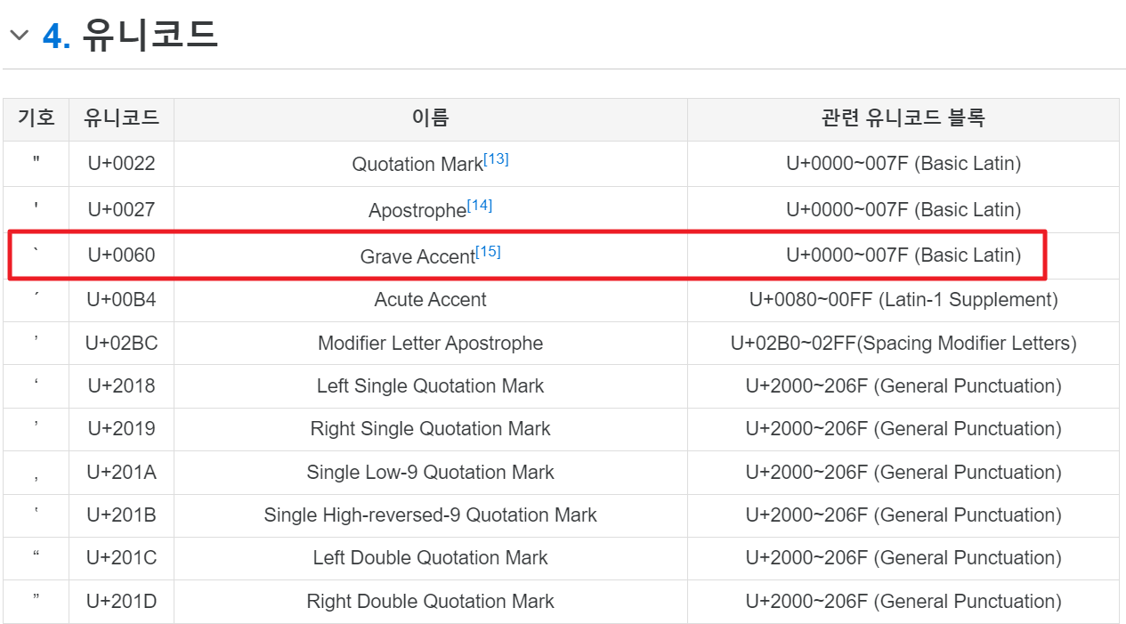 프랑스 문자이지 않을까 했는데 한국말로는 억음부호, tab 키 위에 있는 특수기호였다.