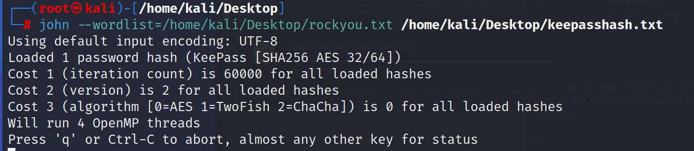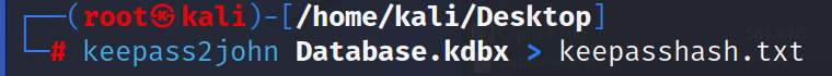 john --wordlist=/home/kali/Desktop/rockyou.txt /home/kali/Desktop/keepasshash.txt hash