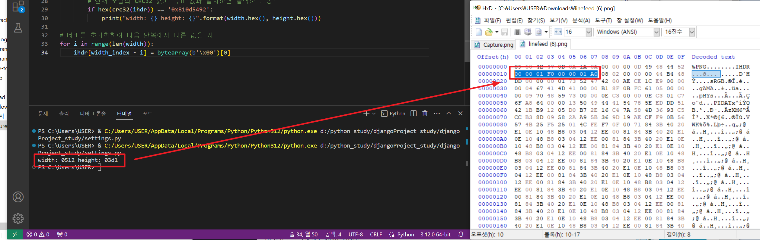 혹시 몰라 LineFeed 문제에서 사용한 PNG 파일의 CRC값에 대해 가로 세로 길이가 다르지 않을까 해서 살펴봤지만, 주어진 파일에서 가로 세로의 넓이는 CRC 길이에 비해 정상이다. 따라서 해당 파일의 원본은 IDHR 청크를 수정해 획득 불가능하다.