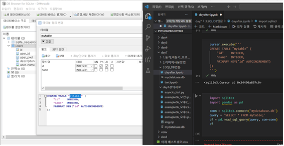 - SQL 문을 DB브라우저에서 만든 후 파이썬에서 커서를 사용해 테이블 생성