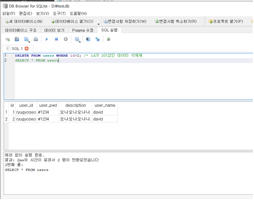DELETE FROM users WHERE id>2; /* id가 2이상인 데이터 삭제