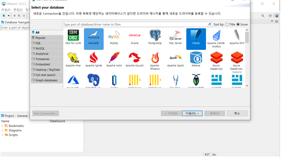 - 생성한 DB를 열고, 관련 드라이버 다운로드( test.db 열람 시도시 드라이버 설치 페이지 생성)