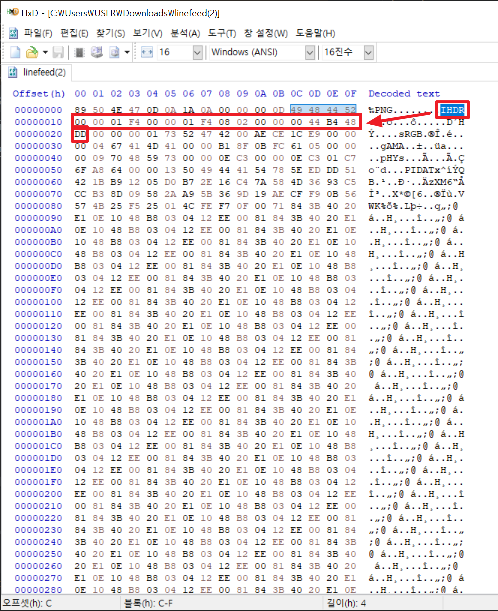 IHDR: 이미지 헤더. "49 48 44 52"로 시작.