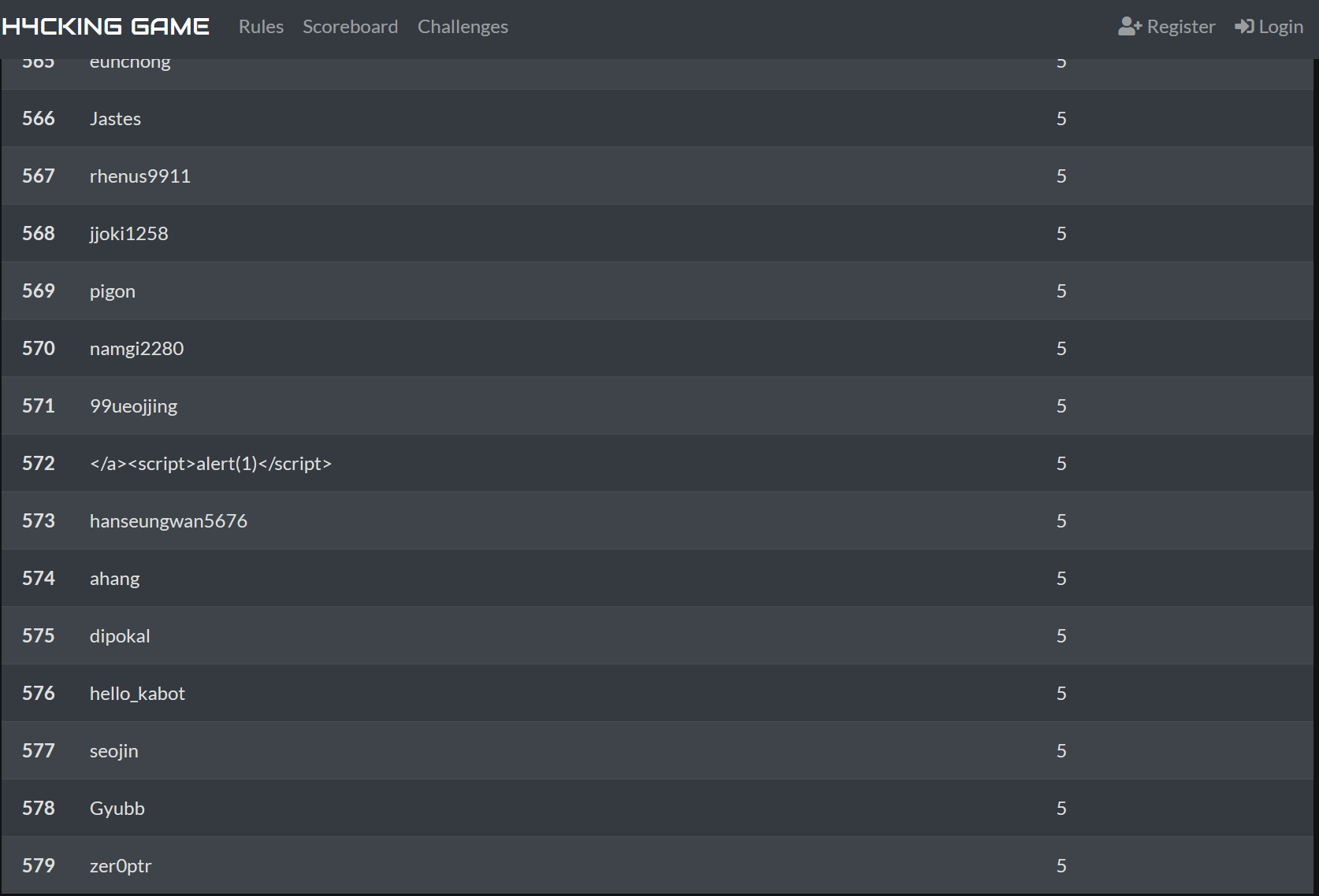 해당 사이트에서는 문제를 맞추면 점수를 준다. 점수로 유저간 랭킹이 있었는데, 누가 아이디를 스크립트문으로 만들어 놓아서 재미있었다. (내가 맞춘 문제는 100 포인트를 주는거라 저 계정은 내가 아니다..)