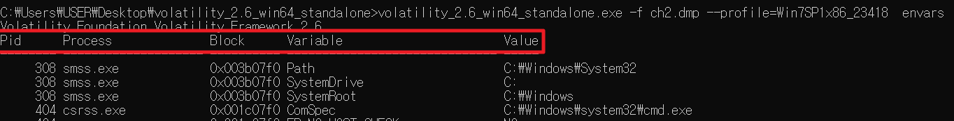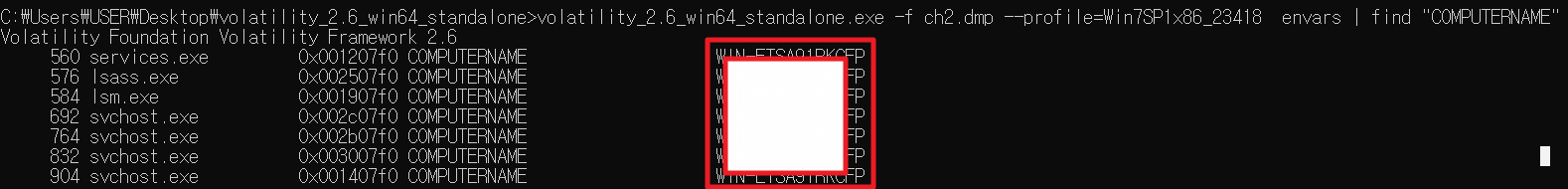 - 사용 명령어 : volatility_2.6_win64_standalone.exe -f ch2.dmp --profile=Win7SP1x86_23418 envars | find "COMPUTERNAME"