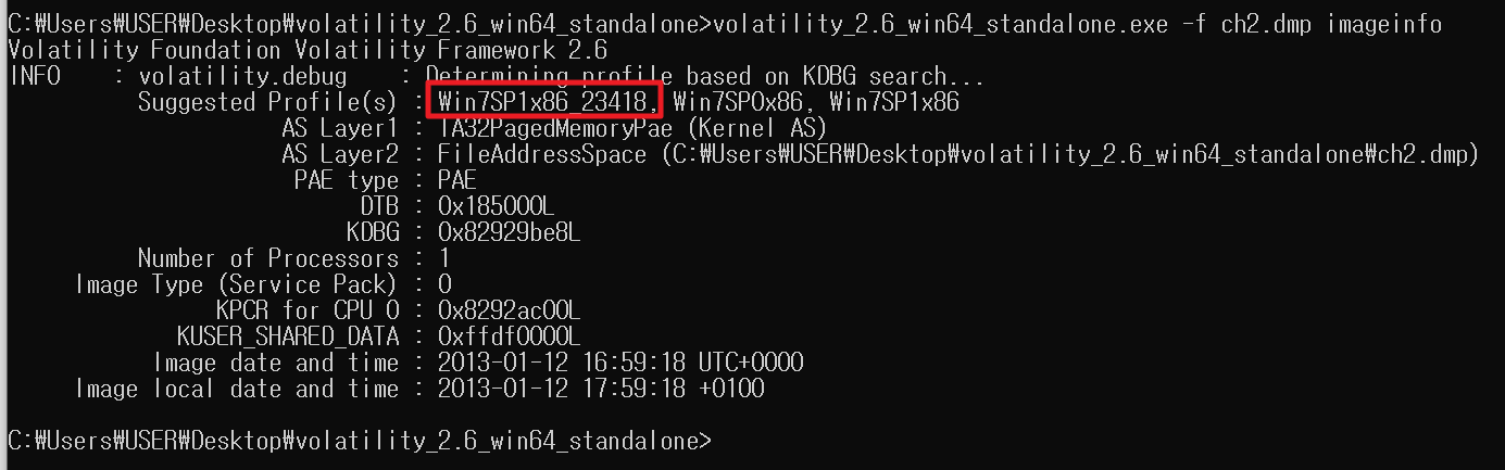 - 사용 명령어 : volatility_2.6_win64_standalone.exe -f ch2.dmp imageinfo