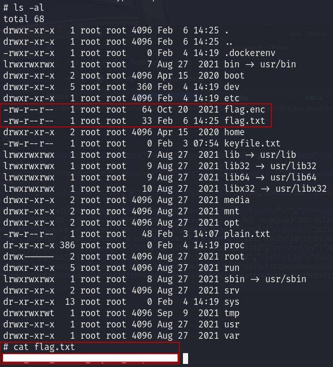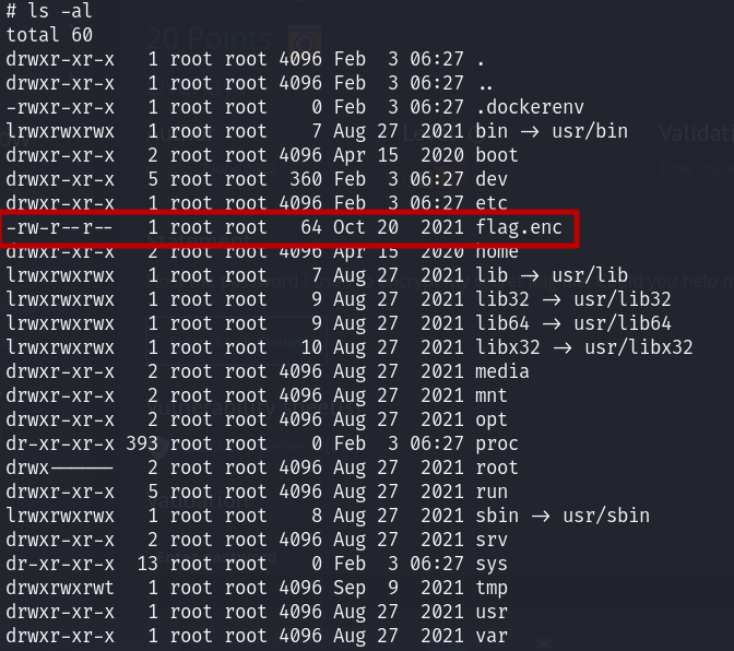 조금더 자세히 살펴보기 위해 ls -al 명령어를 사용하면 flag.enc 라는 암호화된 falg 파일이 보인다.