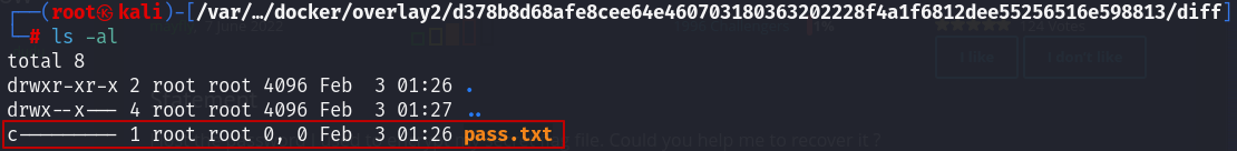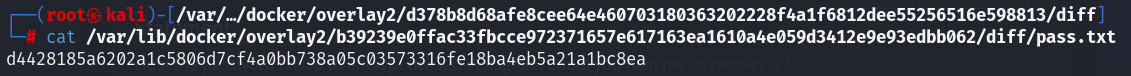 cat /var/lib/docker/overlay2/b39239e0ffac33fbcce972371657e617163ea1610a4e059d3412e9e93edbb062/diff/pass.txt