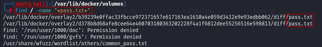 find 명령어 결과에서 docker 이미지와 관련한 pass.txt 파일이 2개 나온다.