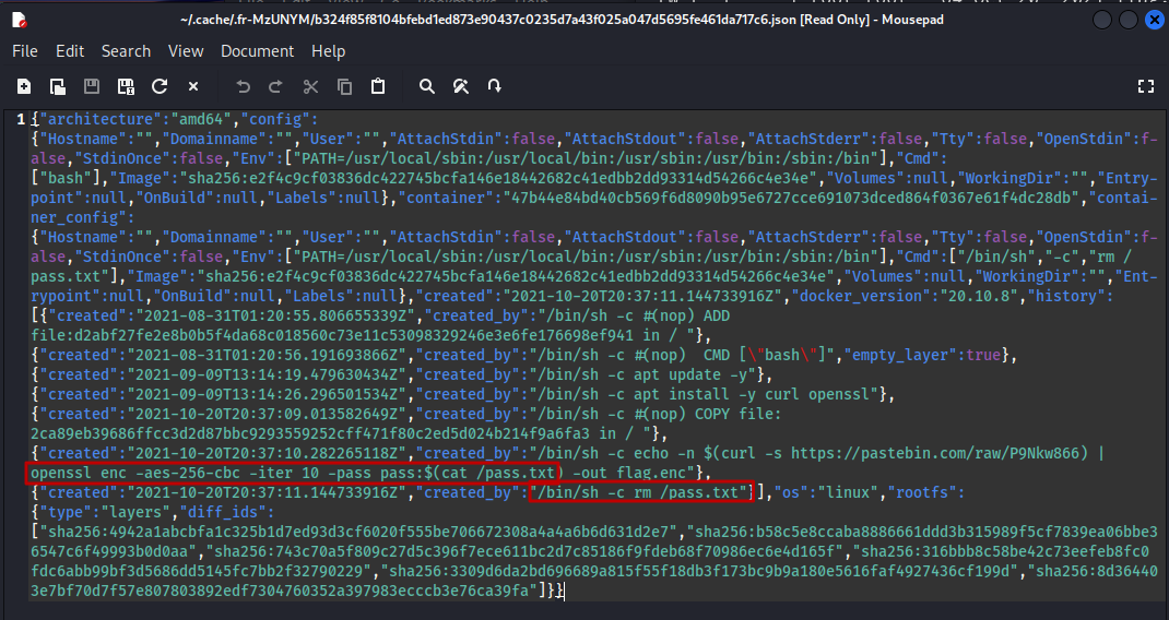 처음 문제를 다운로드 받고 이를 docker run 이전에 manifiest.json 파일을 확인하면, docker run 시 발생하는 내용을 확인할 수 있는데, 문제에서 제시하는 암호화에 사용되는 password 파일을 암호화 파일(문제의 flag가 있는 파일)을 생성하고 rm 명령어로 삭제해 버린다.
