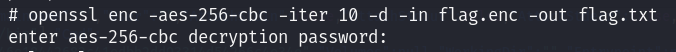 openssl enc -aes-256-cbc -iter 10 -d -in flag.enc -out flag.txt