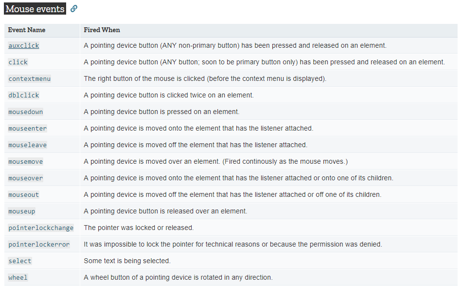 https://developer.mozilla.org/en-US/docs/Web/Events#Mouse_events 참조