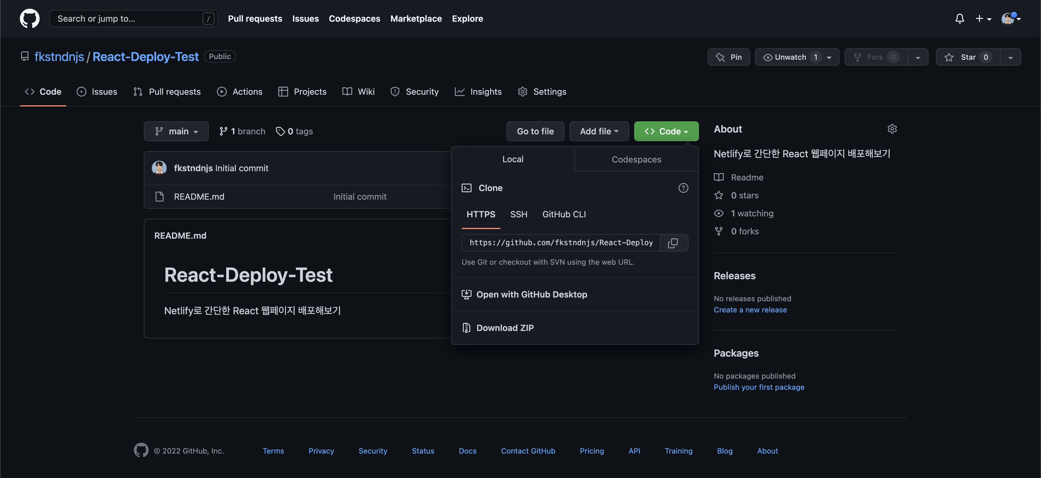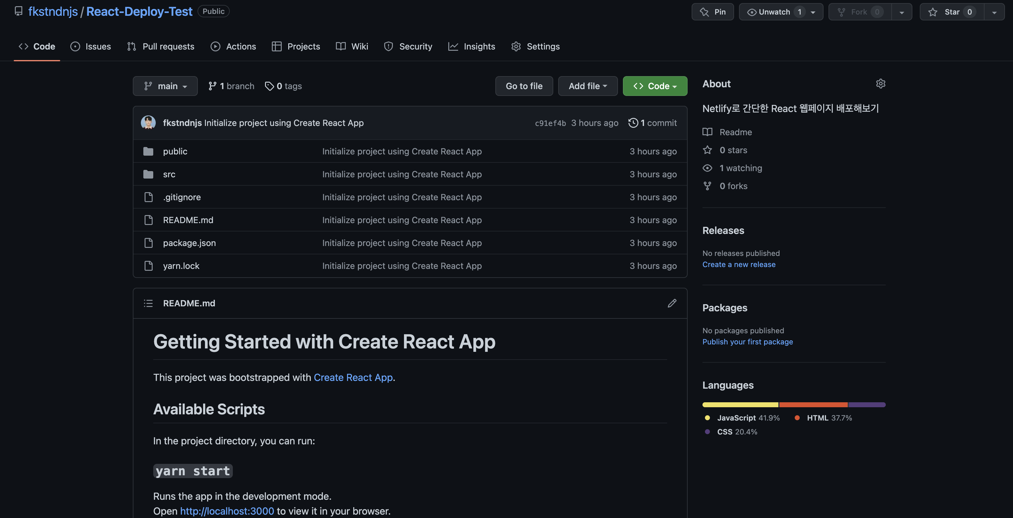 2-5. Git과 연결이 되었으니 이제 deploy-test 폴더를 Git에 올릴 차례인데, 필자는 로컬 브랜치의 이름이 master로 되어있어서 'git branch -M main'으로 Git의 브랜치와 이름을 맞춰주었다. 자신의 브랜치가 무슨 이름으로 되어있는지 궁금하다면 'git branch' 명령으로 확인해보고 master로 되어있으면 'git branch -M main' 명령으로 바꿔주자. 그리고 'git push orign main' 명령으로 Git에 폴더를 올리면 되지만 필자는 위에서 React-Deploy-Test를 생성할 때 README.md 파일을 같이 생성하는 옵션을 선택하는 바람에 deploy-test와 React-Deploy-Test의 커밋 history가 달라서 '--force'옵션을 통해 강제 푸시를 해주었다. README.md 옵션을 선택하지 않았다면 '--force' 옵션을 주지 않아도 업로드가 잘 될 것이다. 그럼 다음과 같이 폴더가 Git으로 업로드 된다.