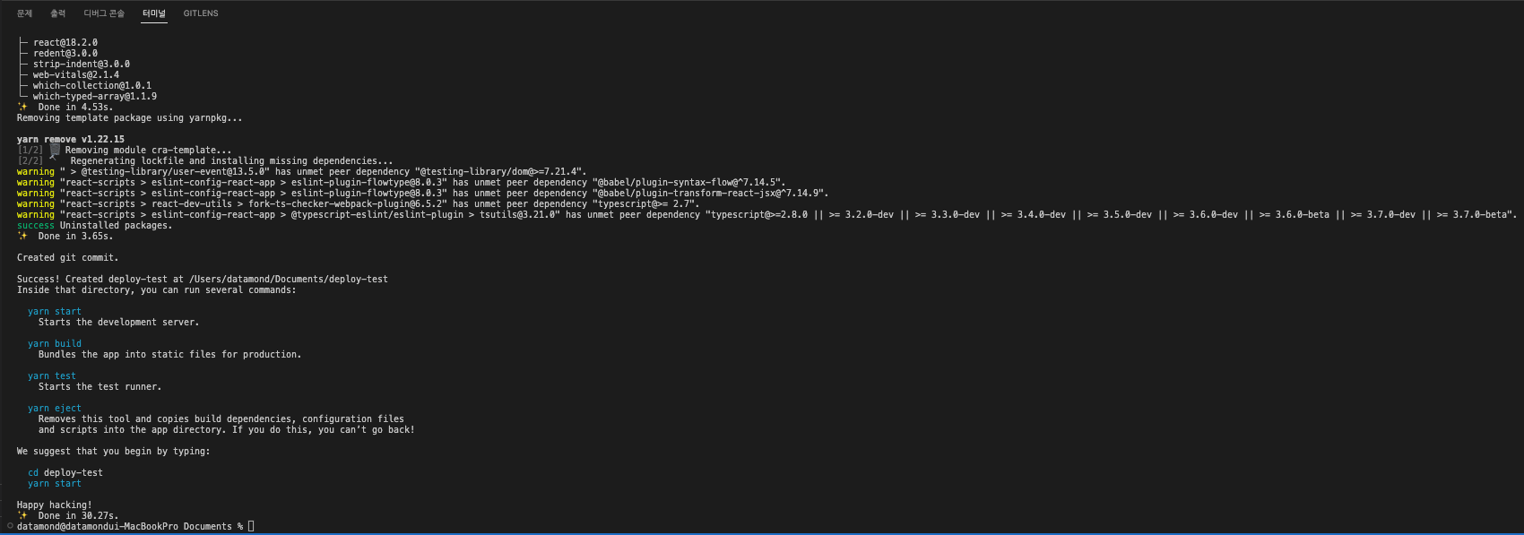 1-3. 'yarn create react-app {폴더명}' 명령으로 React 기본 템플릿이 담겨있는 폴더를 생성해준다. 필자는 폴더명을 deploy-test로 하였다.