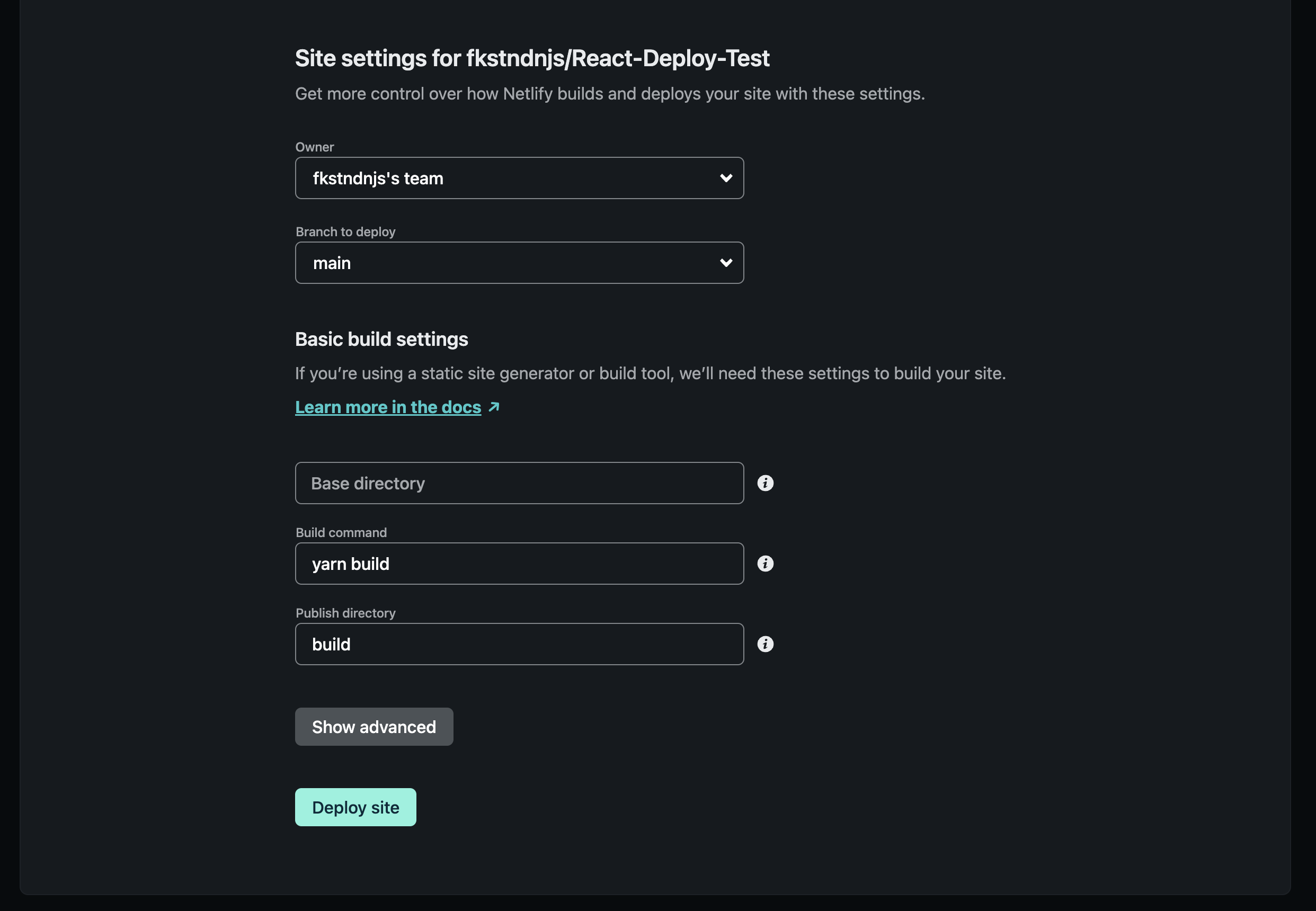3-4. 이 화면이 나올텐데 다른 건 건드리지 않아도 되고 Build command와 Publish directory 입력란을 다음과 같이 작성해준다. Build command는 파일을 빌드할 때 사용할 명령어를 작성하는 란이고, Publish directory는 빌드가 되어 실행할 준비를 마친 파일이 담겨있는 폴더의 이름을 작성하는 란이다. 처음에 'yarn create react-app {폴더명}' 명령으로 생성했던 React 템플릿의 기본 설정은 각각 'yarn build'와 'build'이다. 작성을 마쳤다면 맨 밑의 Deploy site 버튼을 클릭한다.