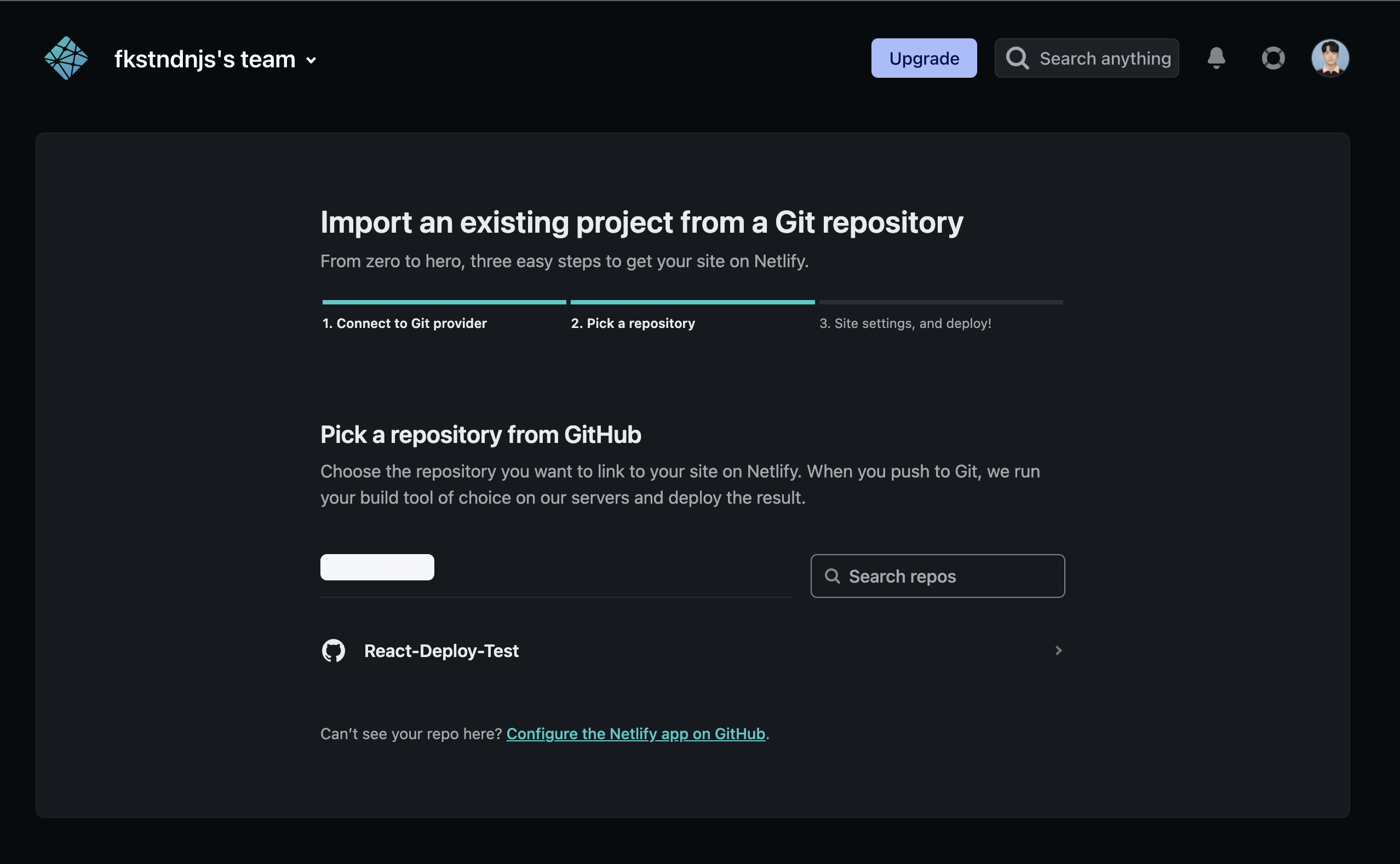 3-3. 여기서 Repositoy를 선택하라고 나올텐데 모든 Repository를 나오게 해도 되고 몇 개를 선택해도 된다. 필자는 React-Deploy-Test만 나오게 설정을 했다. 여전히 Repository가 목록에 나오지 않거나 추후에 이 설정을 바꾸고 싶다면 맨 밑의 'Configure the Netlify app on GitHub'을 클릭해서 설정해주면 된다. React-Deploy-Test가 목록에 나왔다면 클릭해서 다음 과정으로 넘어가자
