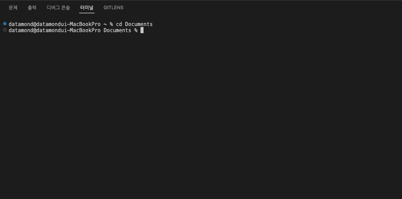 1-2. 'cd'명령으로 작업할 폴더로 이동한다. 필자는 Documents 폴더 안에서 작업할 것이기 때문에 'cd Documents' 명령으로 Documents 폴더로 이동하였다.