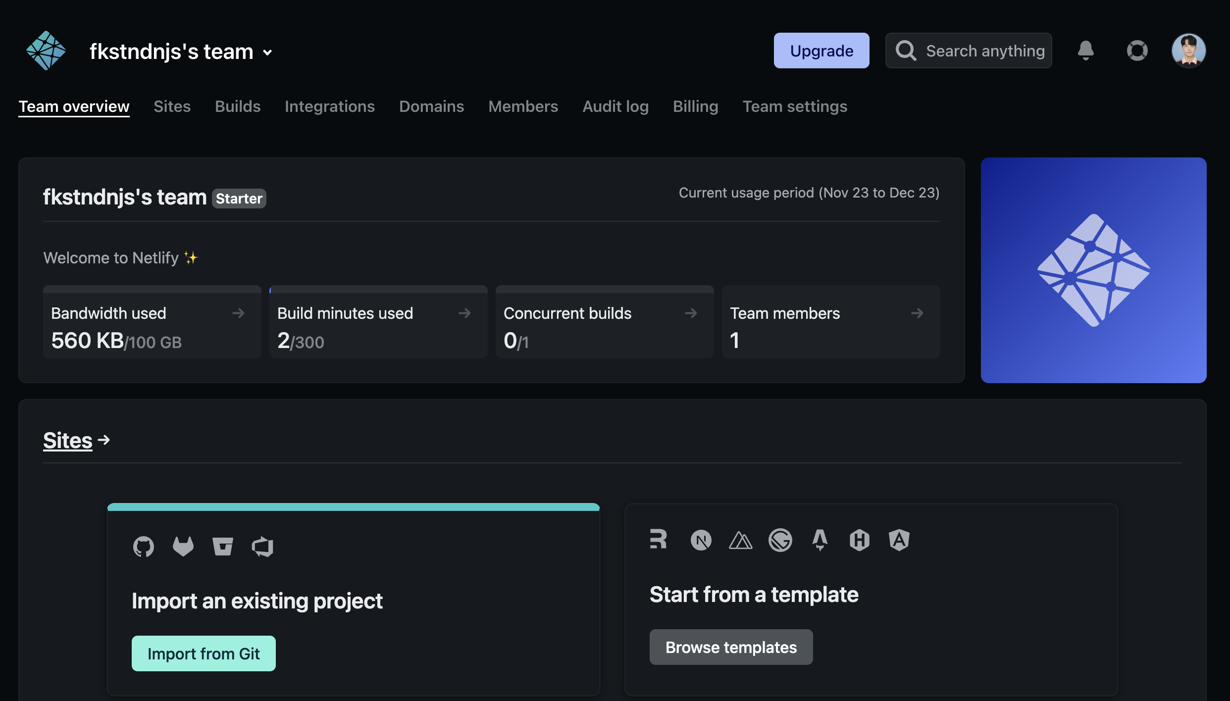 3-1. 먼저 Netlify에 가입을 해준다. Netlify에 가입을 하고나면 다음과 같은 화면이 보일 것이다. 여기서 Import from Git 버튼을 클릭한다.