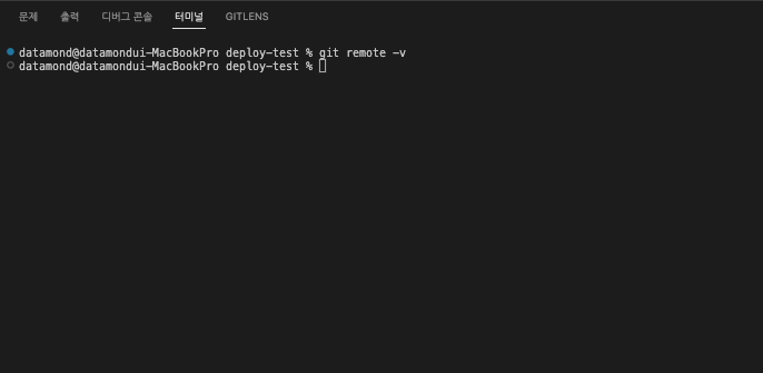 2-1. 이제 Git에 deploy-test폴더를 올리면 되지만, 이 폴더는 아직 Git과 연결이 되어있지 않은 상태이다. remote -v 명령을 통해 Git과 연결된 repository가 있는지 확인할 수 있다. 현재 deploy-test는 Git의 어느 repository와도 연결되어있지 않으므로 명령을 입력해도 터미널에 아무것도 출력되지 않는다.