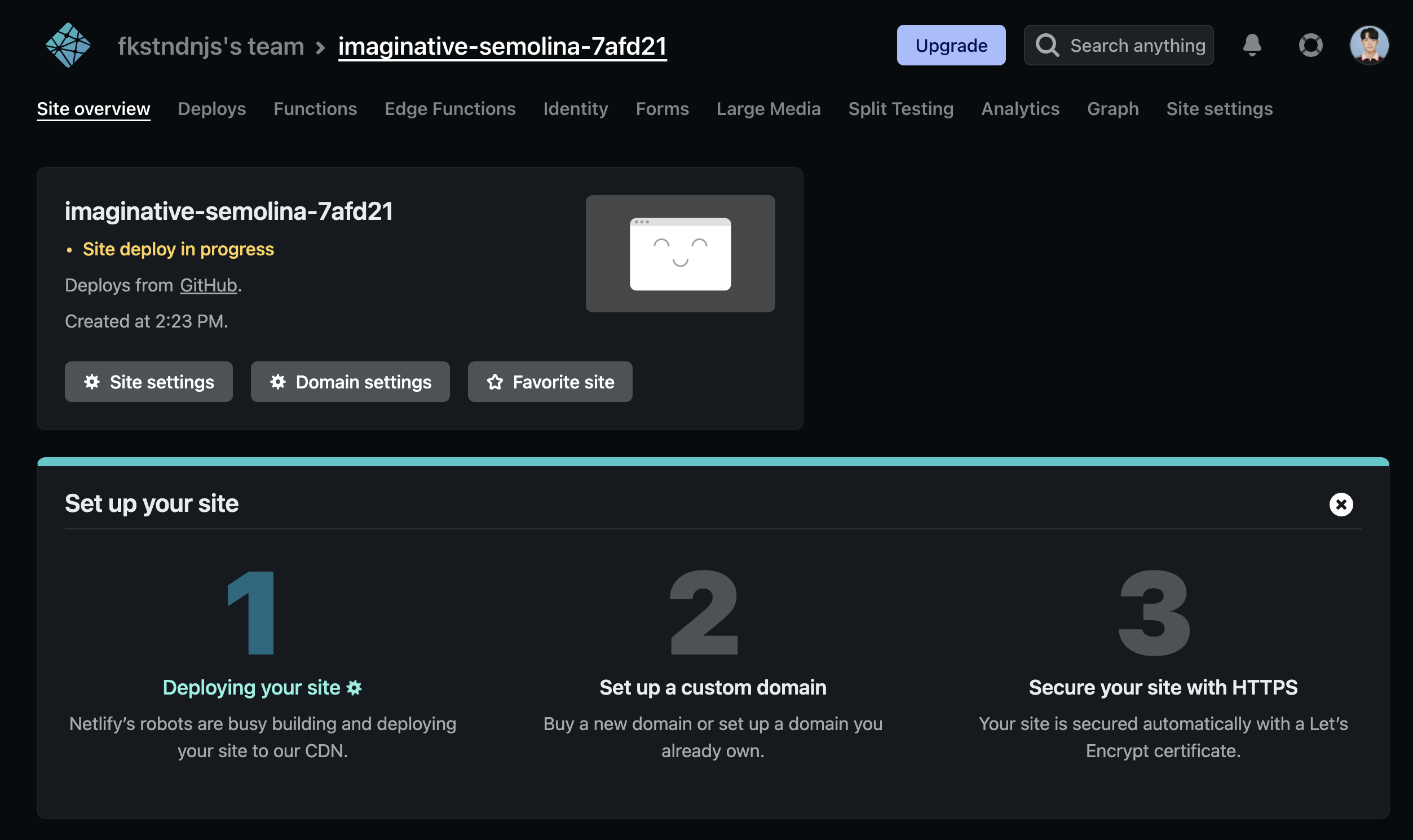 3-5. 버튼을 클릭하면 다음과 같은 화면에 'Site deploy in progress'라는 메세지와 함께 배포가 진행된다.