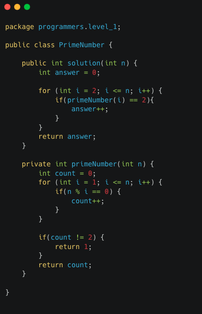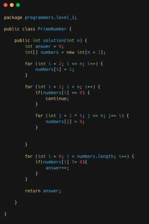 - 이 과정을 반복한 후 소수 배열의 길이를 구하면 몇개의 소수가 있는지 찾을 수 있다.