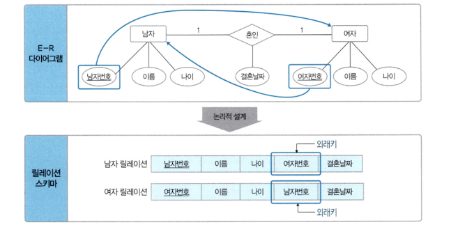 일반적인 일대일 관계는 릴레이션으로 변환하지 않고 외래키로만 표현한다.