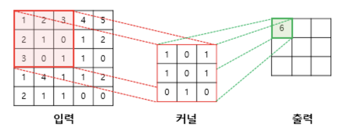 합성곱 연산이란 커널(kernel) 또는 필터(filter) 라는 n × m 크기의 행렬로 높이(height) × 너비(width) 크기의 이미지를 처음부터 끝까지 겹치며 훑으면서 n × m 크기의 겹쳐지는 부분의 각 이미지와 커널의 원소의 값을 곱해서 모두 더한 값을 출력으로 하는 것을 말합니다. 이때, 이미지의 가장 왼쪽 위부터 가장 오른쪽 아래까지 순차적으로 훑습니다.