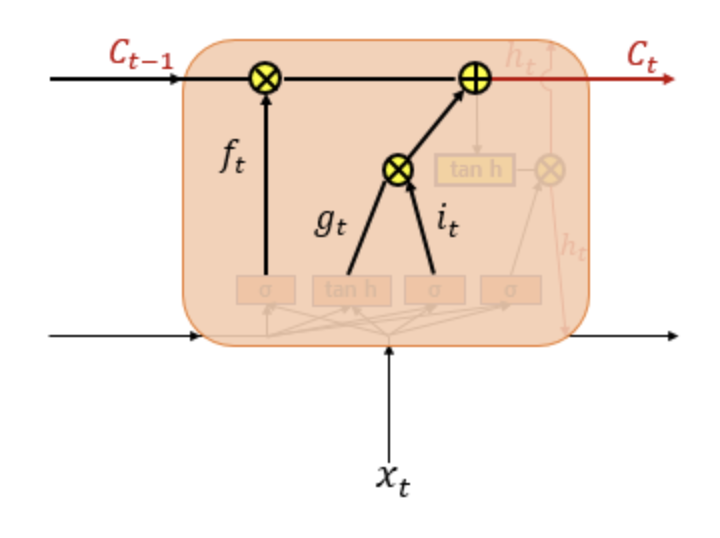 - Ct=ft∘Ct−1+it∘gt